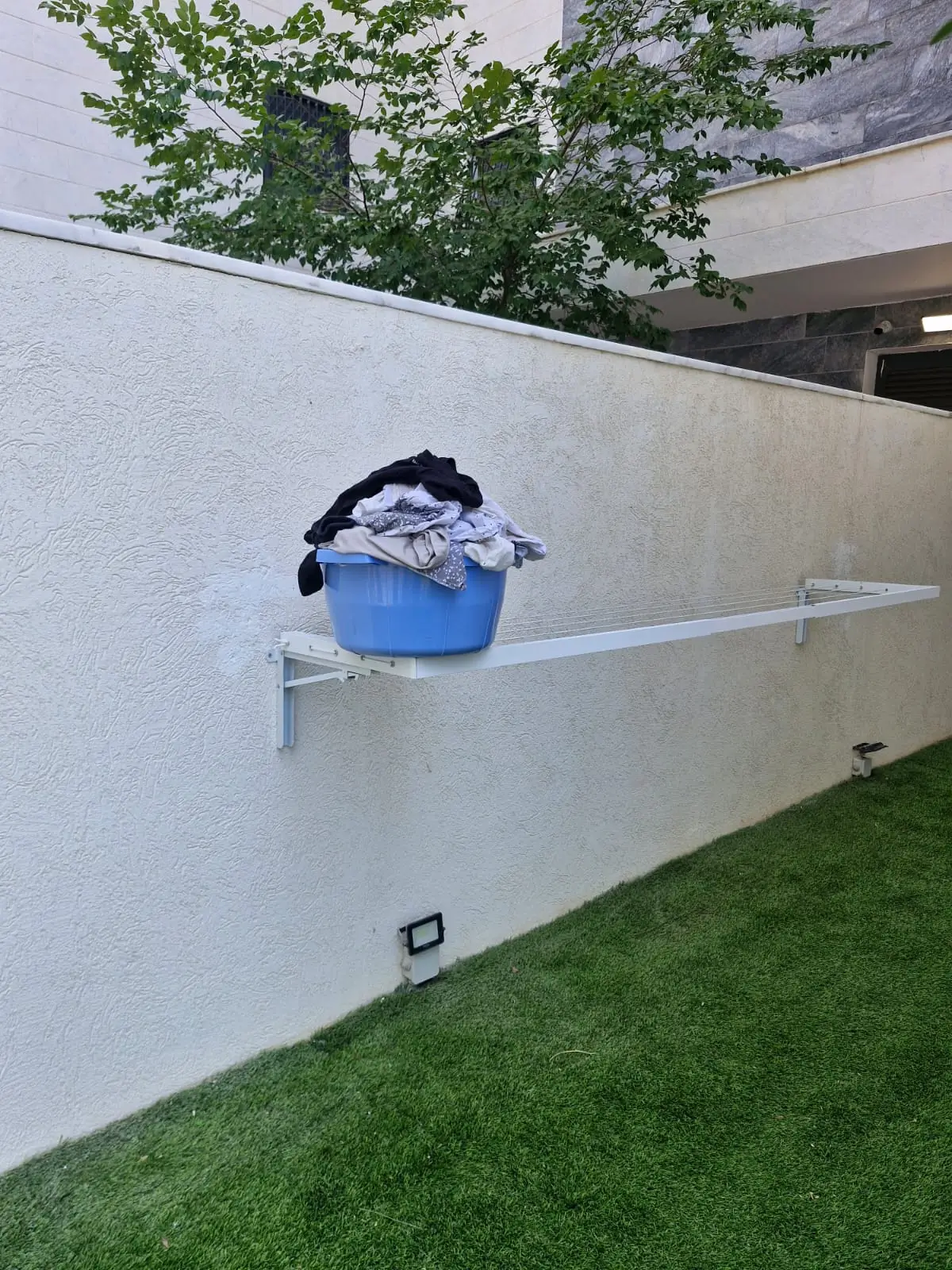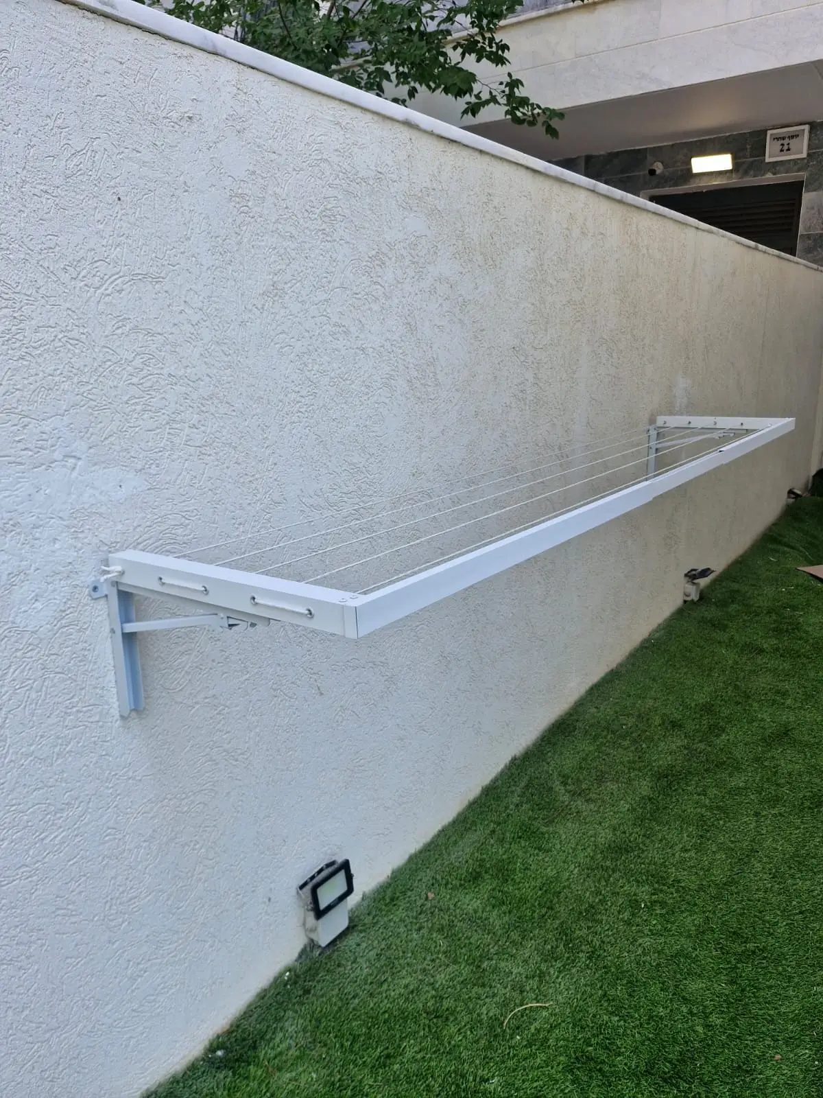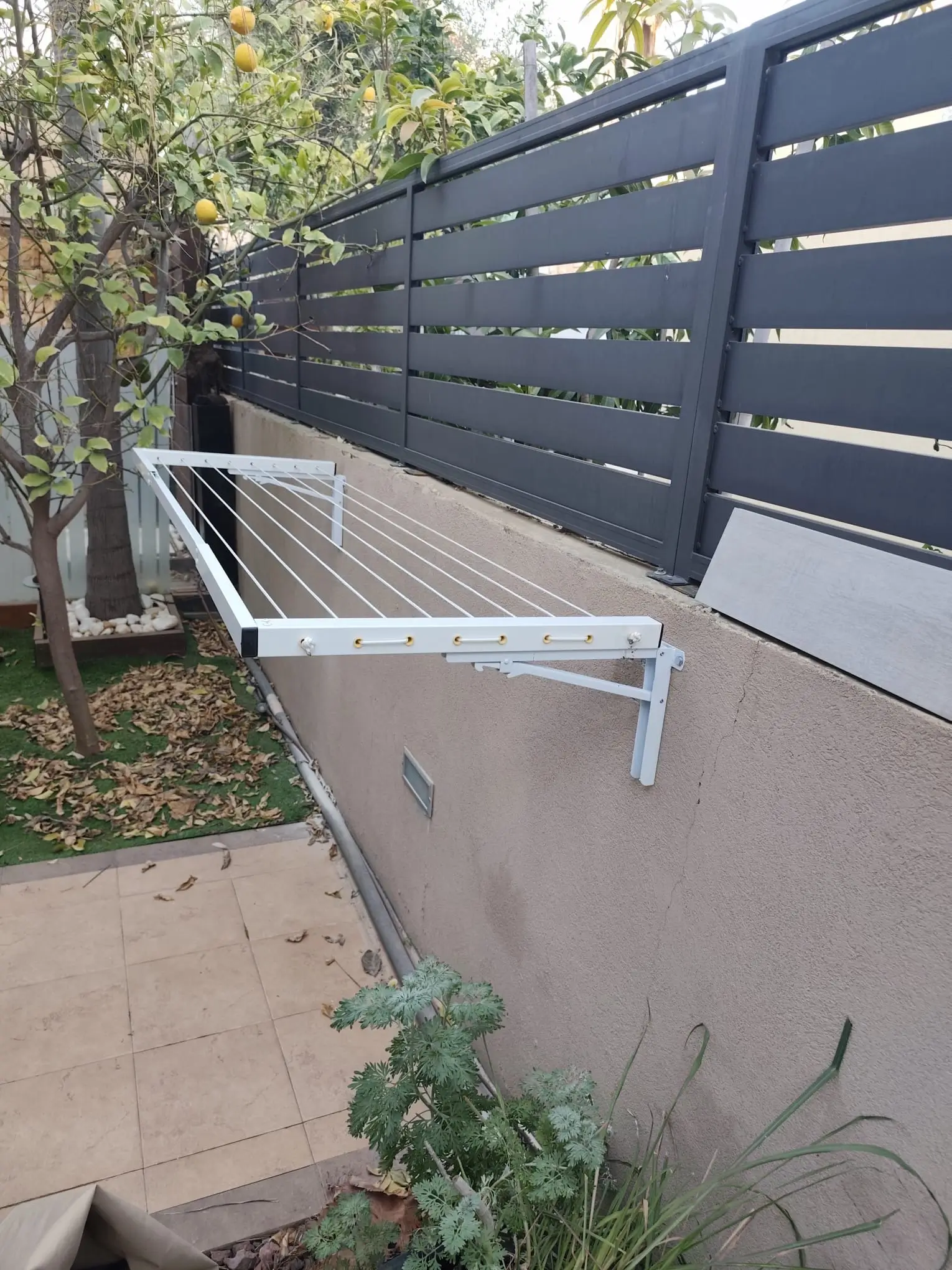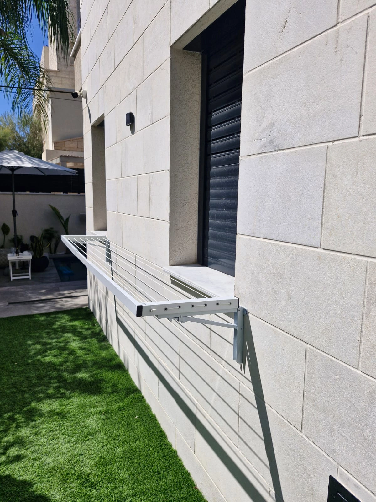 הכירו את פתרון הכביסה האידיאלי למרפסות שמש, חצרות ודירות גג – מתלה נצמד לקיר ומתקפל חזק, נוח, אלגנטי ועמיד במיוחד.